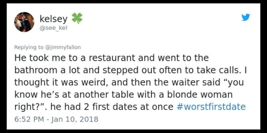 Instead of apologizing or coming clean, the guy acted like nothing was wrong. If it weren’t for the kind waiter, Kelsey might have sat through the whole dinner unaware. Thankfully, she made a quick exit and avoided a major emotional mess. It’s one thing to casually date, but trying to stack first dates like it’s speed dating? That’s just cold. Hopefully, she found someone who knows how to focus on one person at a time — and give them the respect they deserve.