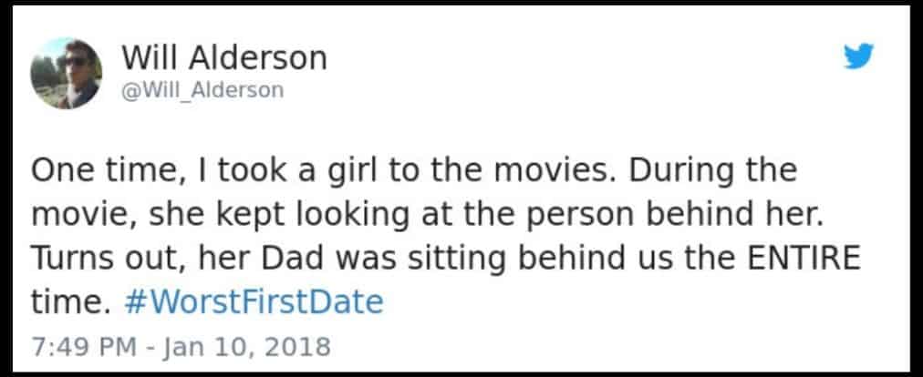 First dates are supposed to be a time to connect one-on-one — not with a chaperone tagging along. That didn’t stop this girl from showing up with her dad in tow. Whether it was her decision or her father’s, we’re not sure. But what we do know is that poor Will got a surprise third wheel, and it made things very awkward very fast.