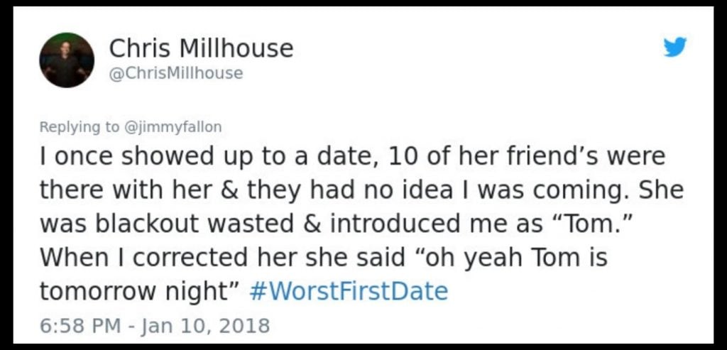 Imagine getting ready for a date, expecting a chill night, and then showing up to a house full of your date’s ten friends. That’s already enough of a surprise. But for this guy, it got worse. When she finally greeted him — clearly blackout drunk — she introduced him as “Tom,” which, to make matters even worse, was the name of her next scheduled date. Yep, not awkward at all.