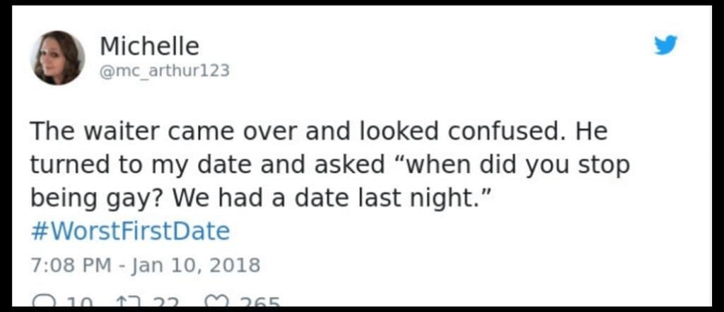 To make matters worse, the waiter seemed to assume her date was gay, ignoring the possibility that he might be bisexual. It was unprofessional, invasive, and totally uncalled for. Michelle was caught in the middle of an awkward and confusing situation she never signed up for. While the details of the date’s past didn’t necessarily bother her, the public airing of it did. A first date should be about getting to know each other at your own pace — not having strangers force conversations you’re not ready to have.