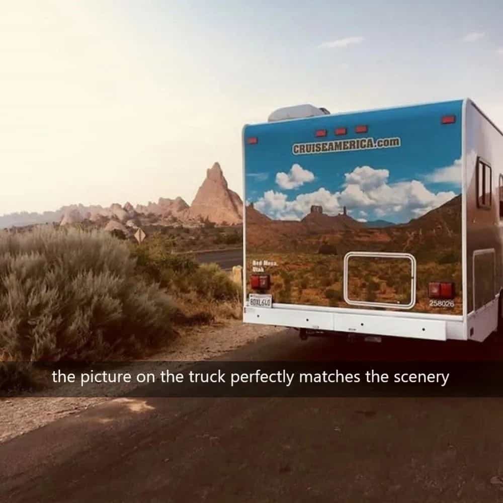 You can encounter many fascinating sights on the road, and this particular image is no exception. At first glance, it may give the impression that someone meticulously painted the car to blend in with the surrounding landscape seamlessly. However, the truth behind this captivating shot is that it’s a remarkable stroke of luck.