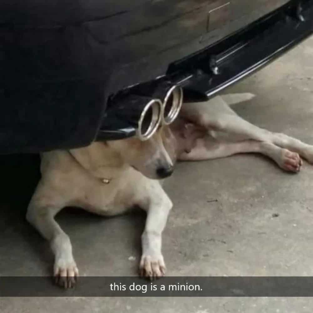 This particular dog was resting beneath a car when the photographer captured this shot. Hidden partially by the car’s exhaust, the dog’s face resembles a pair of round goggles. It’s delightful to see how the essence of these beloved fan-favorite characters can be channeled into an adorable animal.