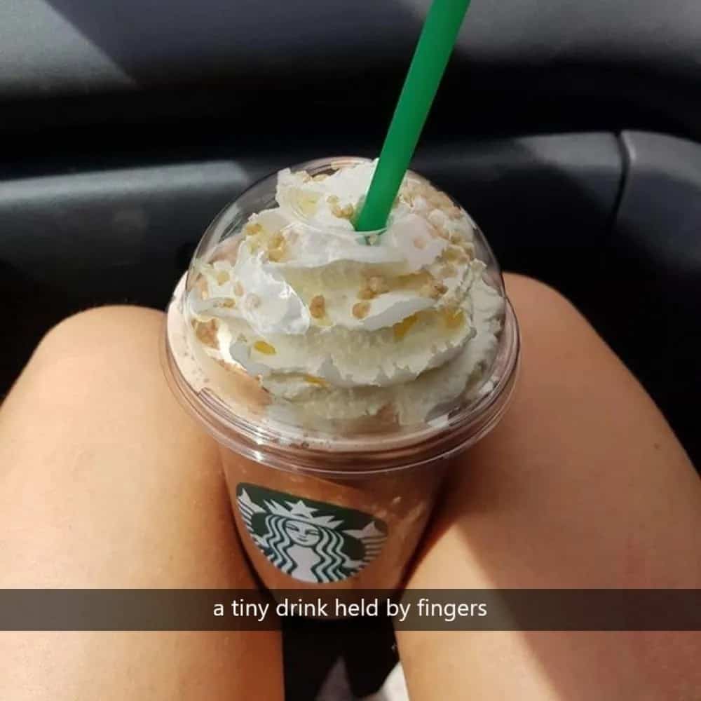 Aside from the tempting sight of fluffy whipped cream adorned with caramel balls atop a delectable Starbucks beverage, another intriguing aspect immediately catches the eye—the appearance of an unusually tiny drink seemingly cradled between two fingers. This optical illusion plays a delightful trick in our perception. However, the reality is quite different and rather impressive.