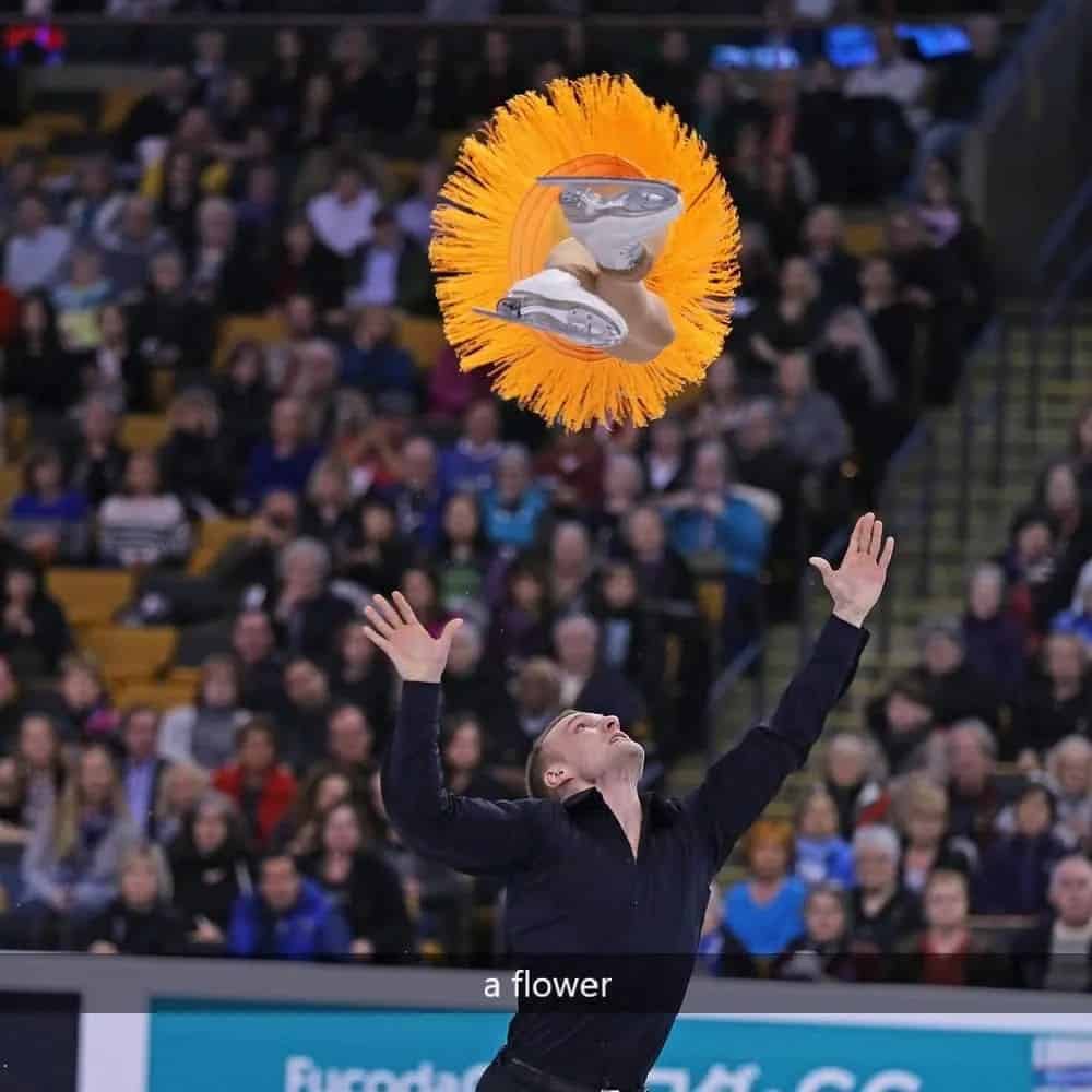 At first glance, the sight of a man hurling a giant sunflower onto an ice track appears utterly perplexing and devoid of logic. However, this visual riddle unravels when you realize the object is not a flower. This revelation becomes much clearer, especially as your gaze shifts toward the female ice skater. She glides into the air after the male skater’s toss, and her stunning yellow, frilly skirt creates an illusion that closely resembles the petals of a yellow flower reminiscent of a sunflower. The optical trickery is further enhanced as her gracefully crossed legs contribute to the illusion, seamlessly merging reality with artistry in a truly captivating manner.