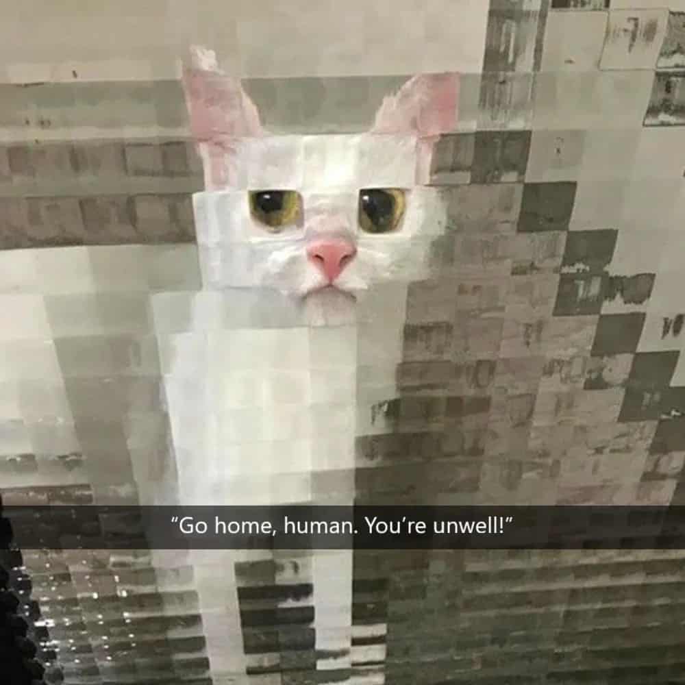 Contrary to the widespread belief that this image portrays a meme-worthy or pixelated cat, it’s, in fact, a portrait of a profoundly disgruntled feline seen through frosted glass. The glass effectively distorts the lens, altering the cat’s appearance by enlarging its eyes and forming a downturned mouth, creating the illusion of pixelation. The result is a cat that appears to judge every life decision with a pixelated, disapproving gaze. This whimsical twist on reality introduces an element of humor and charm, offering a unique perspective on our feline friends.