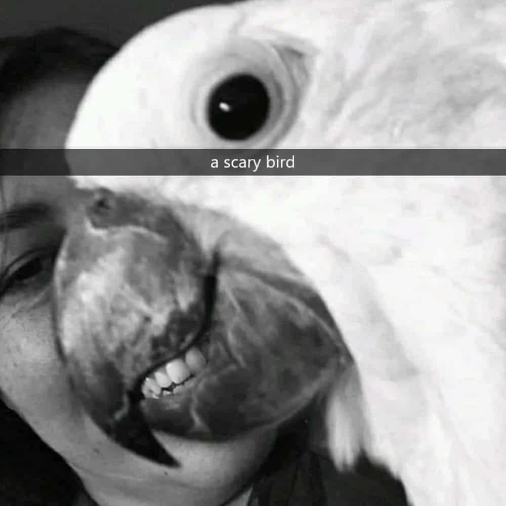 At first glance, the image presents a genuinely alarming sight—a bird that appears to harbor a formidable set of teeth concealed within its beak, sporting a disconcerting, maniacal smile. The immediate reaction might be genuine trepidation, as it seems like the kind of bird your therapist warned you about. However, a closer examination reveals the true nature of this avian enigma. The bird’s beak is agape, and the menacing teeth belong to the woman in the background, flashing a radiant and joyous smile. This optical illusion, born from perfect timing and perspective, momentarily transforms the innocent bird into an unwittingly intimidating creature that might just give you a jump scare.
