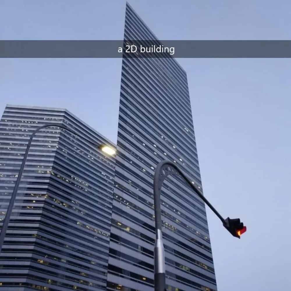In visual trickery, this image is a classic example of how lighting and angles can collaborate to deceive the human brain into perceiving objects in ways contrary to reality. At first glance, you might find accepting that this structure is a building challenging. Instead, it depicts two buildings meticulously rendered side by side in a two-dimensional format, akin to an intricate architectural drawing. The baffling aspect of this image lies in how it appears so flat and devoid of dimension, leaving us with a bewildering visual problem that prompts us to question the reliability of our perception.