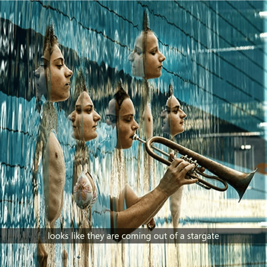 However, the complexity of this image simplifies when it undergoes a 90-degree rotation, revealing its true essence. In reality, these individuals are swimmers floating on water, and the photograph has been captured from a unique vantage point at the water’s surface. What adds to the scene’s charm is the girl skillfully playing the trumpet while effortlessly buoyed by the water. This transformation from enigmatic stargate travelers to leisurely swimmers underscores the power of perspective and challenges us to see the world from different angles.