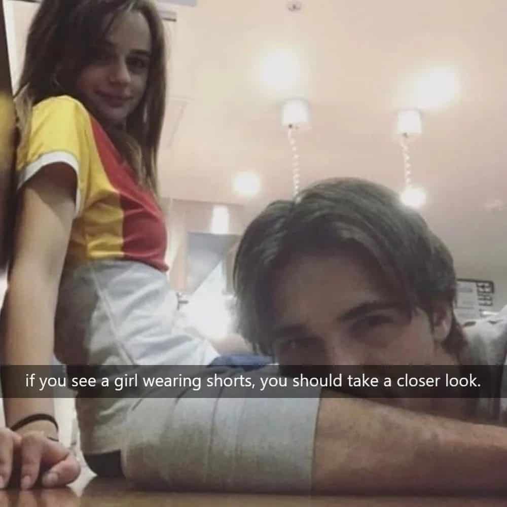 At first glance, it may appear that Joey is sporting a pair of grey shorts. However, upon closer inspection, it becomes evident that the grey “shorts” are Jacob’s sleeves, and her leg is cleverly positioned to resemble Jacob’s arm.