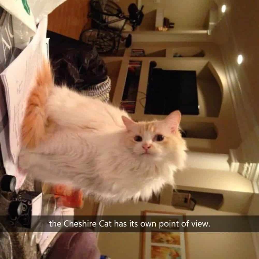 This image introduces us to one of the most endearing and charming cats we’ve ever seen. The cute little furball has achieved a whimsical “Cheshire Cat” vibe by twisting its head a full 90 degrees. While the Cheshire Cat is known for its signature mischievous grin, this feline balances sporting that enigmatic grin and being irresistibly fluffy.