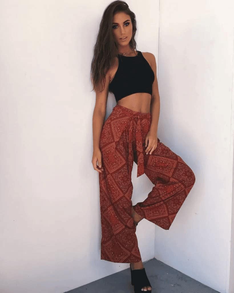 A black crop top is the ideal canvas for an outfit anchored by a striking pair of boldly patterned harem pants. These red harem pants are a festival essential – comfortable, practical, stylish, and functional, keeping her cool as she dances the day and night away under the hot sun.