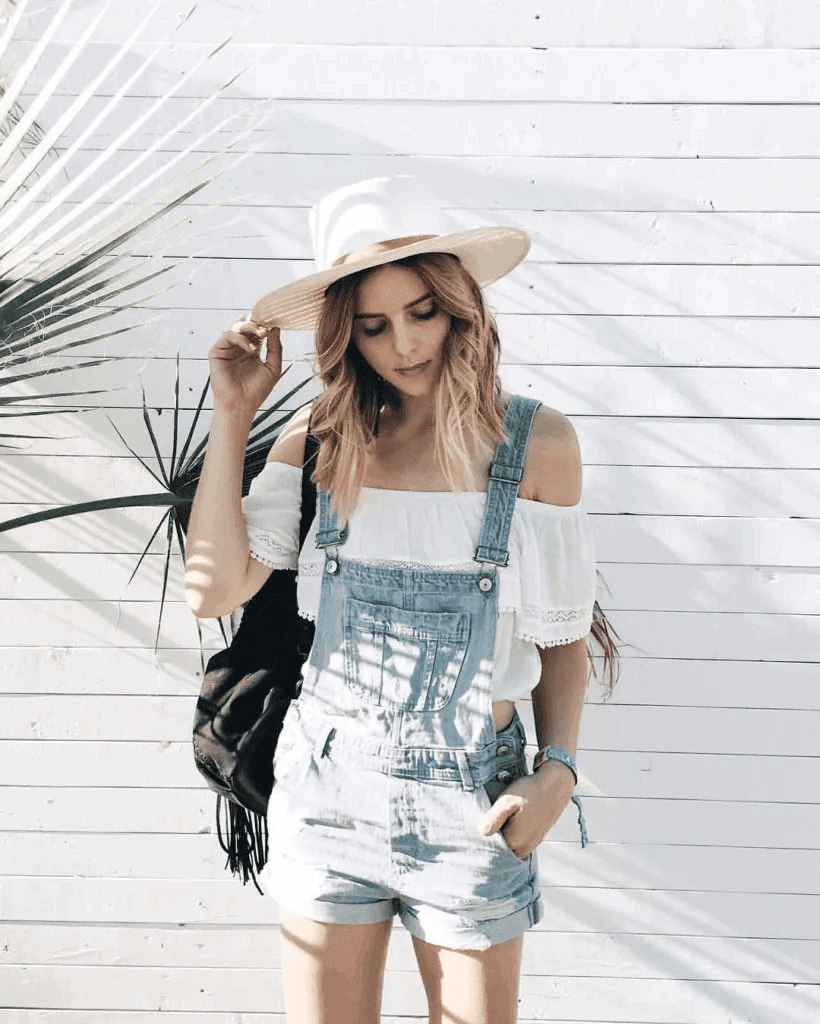 This fashion-savvy individual combined three must-have elements for any Coachella outfit: a hat, denim, and a Bardot-style off-the-shoulder top, resulting in the ultimate festival ensemble. She chose to incorporate her denim in overall form while sporting a white ruffled Bardot crop top underneath.
