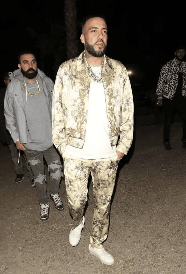 French Montana whipped up a tropical storm with his palm tree-covered matching set at Coachella 2018. Leading his entourage, he sported matching pants and a jacket adorned with gold.