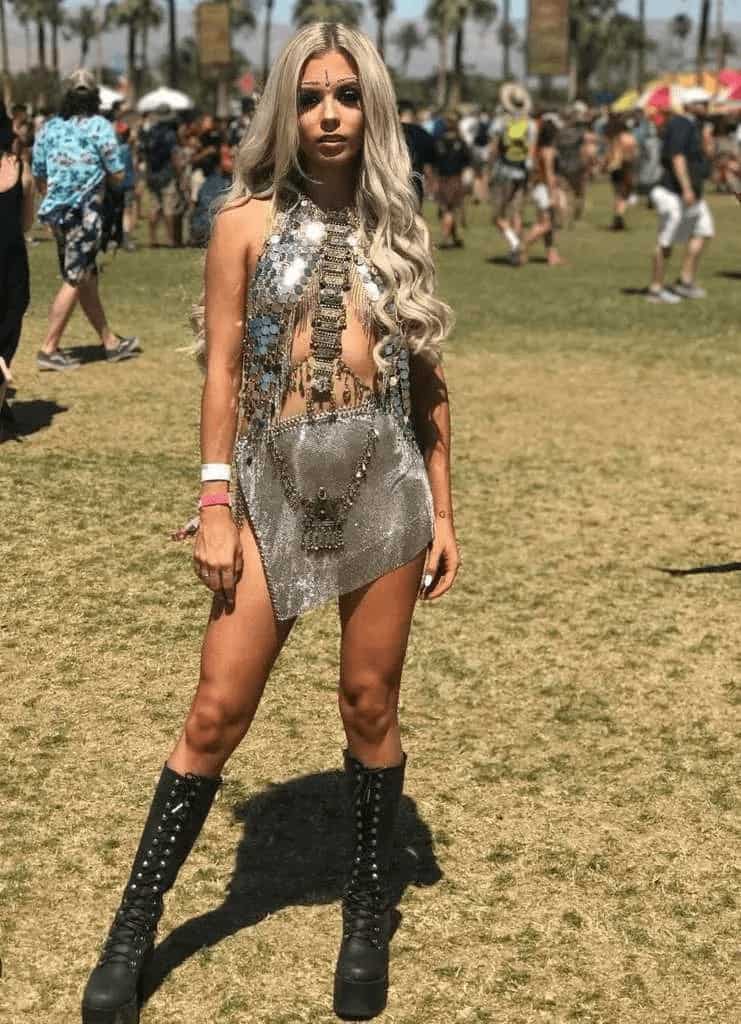 This individual has mastered the metallic look. Knee-high lace-up boots reveal her commitment to dancing without concern for concertgoers accidentally stepping on her feet.