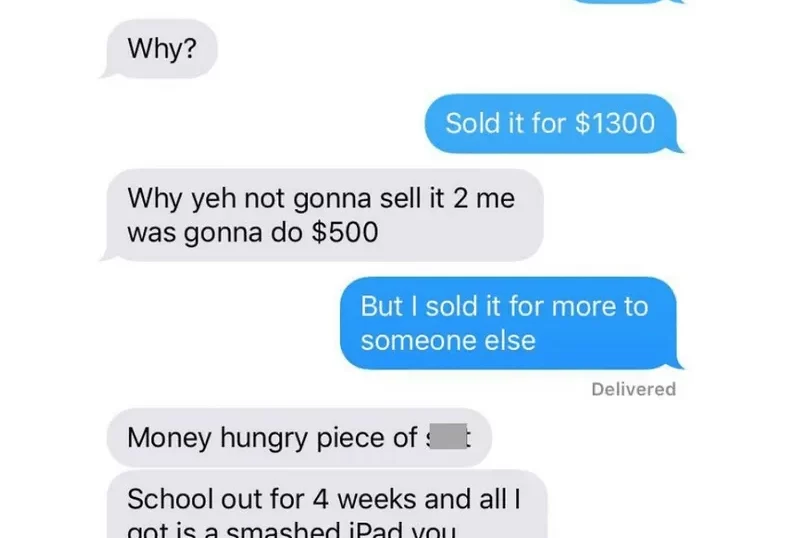 They definitely aren’t a friend now after calling him money hungry just for not selling something for a ridiculously low price. How is it the friend’s fault his iPad is smashed up?