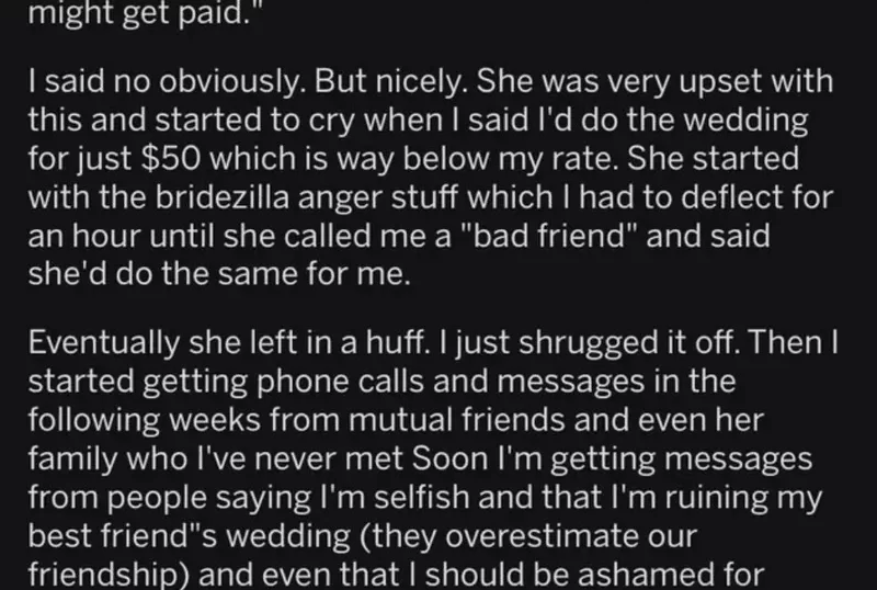 Imagine actually thinking a professional photographer should pay you for the “privilege” of photographing your wedding, and then having your friends harass them when they say no. This person is the definition of toxic.