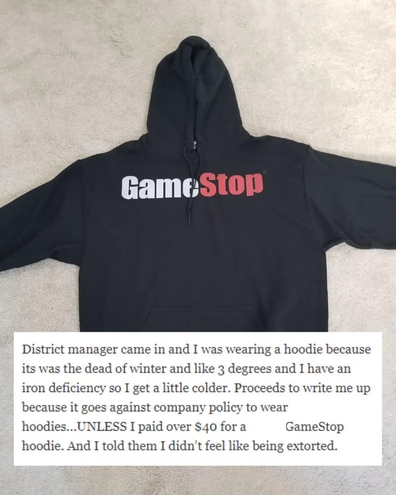 This person did nothing wrong by wearing extra layers to stay warm on the job. What makes it even more frustrating is that the hoodie wasn’t inherently inappropriate; it was merely a means to keep warm. The policy requiring them to purchase a different hoodie for $40 just to stay comfortable in cold conditions appears unfair.