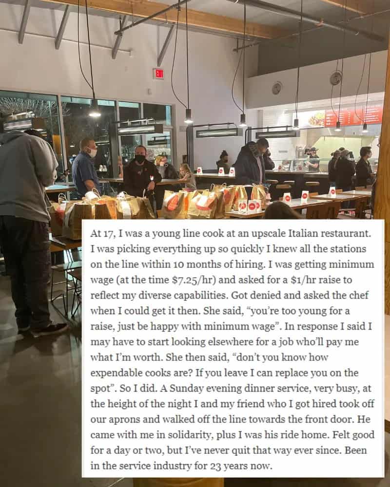 In this “I quit” moment, this person took a stand for themselves, likely due to feeling undervalued and overworked. However, the initial rush of empowerment didn’t seem to last long after they walked away.