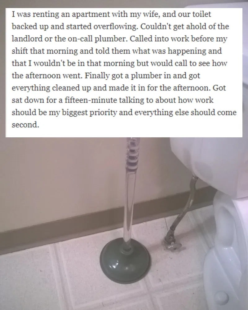 Certain events are beyond an individual’s control. For instance, this person couldn’t have planned for their bathroom to flood in the morning. Remarkably, considering the circumstances, they still managed to make it to the second half of their shift.