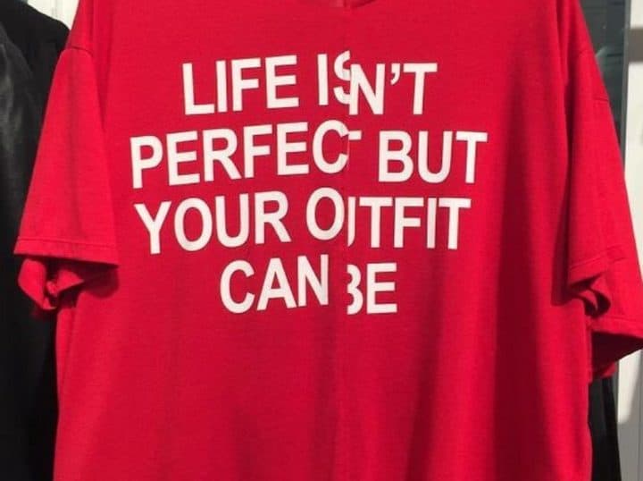 This shirt delves into the imperfections of life, a sentiment often acknowledged as somewhat cliché. However, it also suggests that our outfits can achieve perfection, which seems contradictory, particularly as the words are cut in the center, creating an intentionally imperfect aesthetic.
