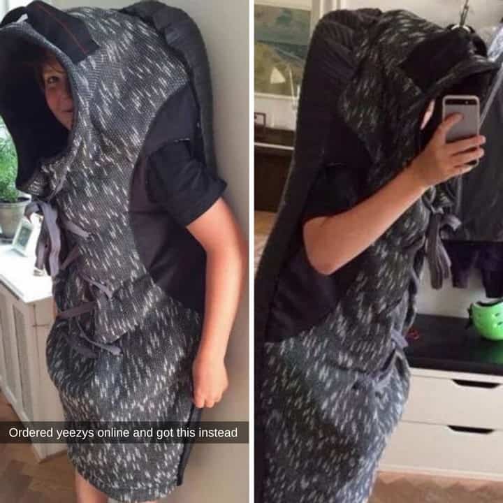 One drawback of online shopping for clothes or accessories is the inability to gauge whether the size will be a good fit. This individual ordered a pair of Yeezys online and received one so oversized that it could function as an outfit in itself.