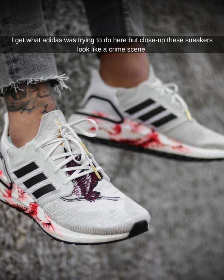 While Adidas aimed for a striking design on these shoes, the predominant use of red on a white background creates an unfortunate resemblance to blood stains. Had they opted for black instead, it’s likely that more people would have been inclined to purchase the shoes.