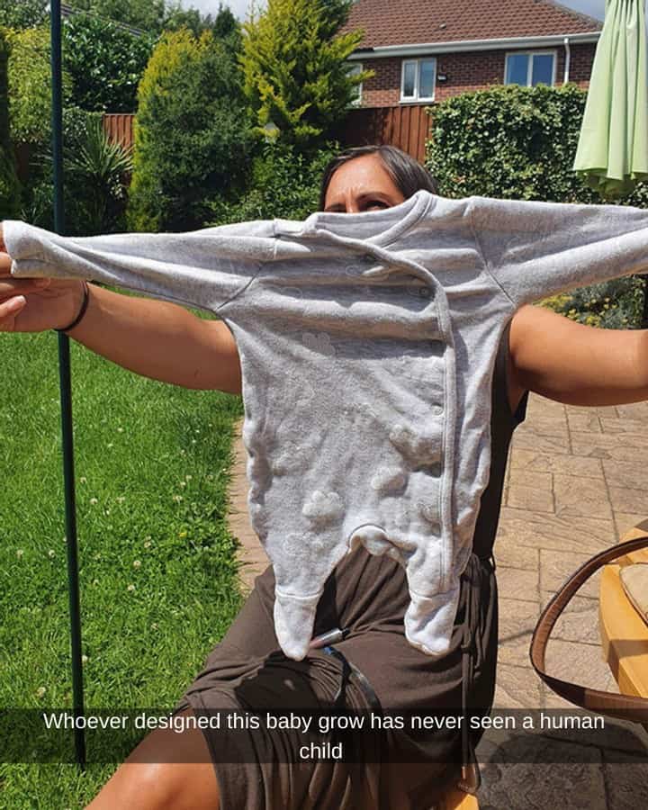 Despite common sense dictating that arms are shorter than legs, this designer seemingly disregarded the rule, granting the baby unusually tight leg space and disproportionately spacious arm sections.