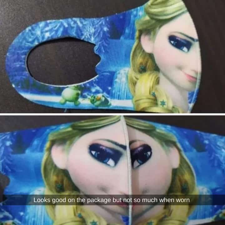 This mask boasts a visually pleasing design when viewed from the side. However, examining it from the front reveals a jarring image of Elsa, with her features laterally inverted, detracting from its appeal.