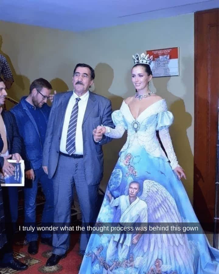 While the intricate design of a wedding dress may be impressive, attention to detail is paramount. In this instance, the placement of a figure resembling a prominent political leader disrupts the elegance of the gown, potentially leading to unintended reactions from wedding guests.