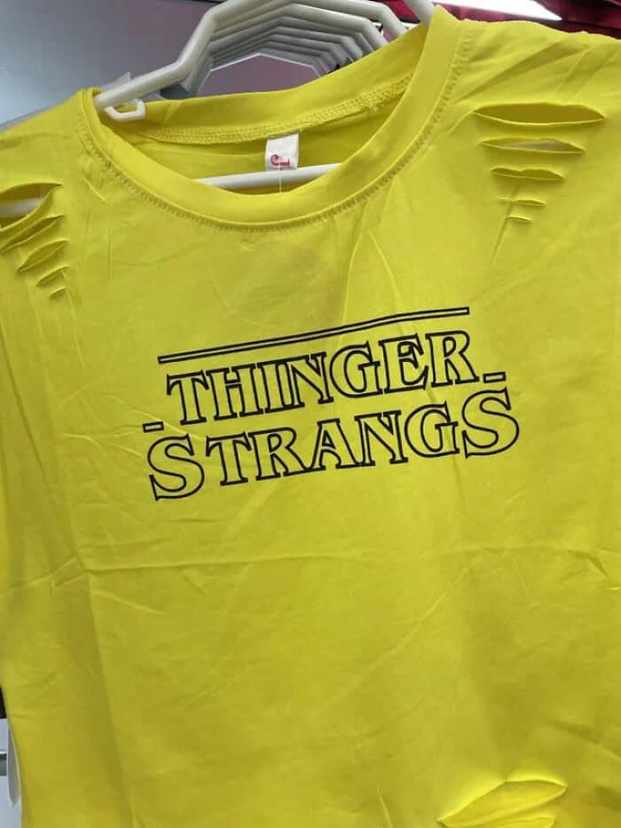 As we eagerly await the fourth season of our favorite show, we stumbled upon a gem on Reddit—a T-shirt cleverly labeled “Thinger Strangs.” Technically, it’s not copyright infringement, right? And those random slits? Let’s just not talk about them…