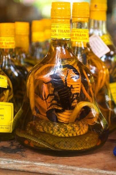Beyond unusual foods, there are also some rather revolting beverages to be found. Scorpion and snake wine is a locally produced liquor found in select parts of Asia. The concoction involves immersing both a snake and a scorpion into a bottle of rice wine, allowing them to ferment for months.