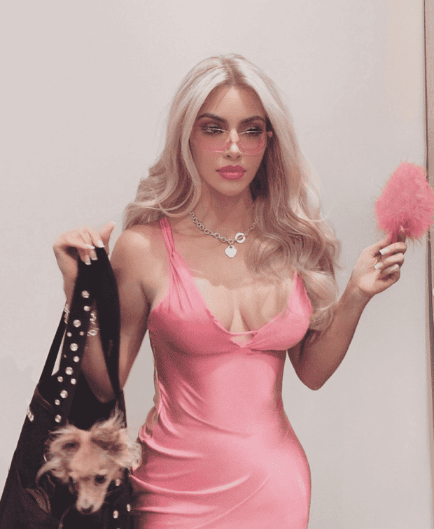Kim channeled Elle Woods in a pink dress, peach-tinted glasses, a black tote adorned with a tiny dog, and Elle’s signature fuzzy pink pen. This homage to the OG blonde lawyer added a delightful nostalgia to Halloween.
