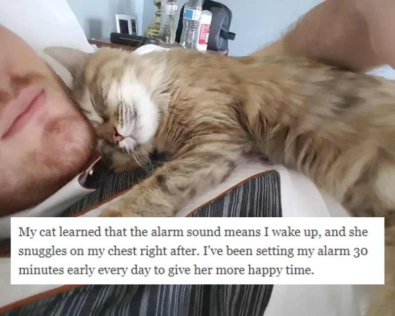 Waking up early can be a challenge for many, but for one lucky cat owner, it’s a joyful routine that comes with furry cuddles. Who wouldn’t want a delightful reason to rise and shine a little earlier? Each morning, this little feline jumps up the moment the alarm goes off, eager for some morning snuggles with her human.