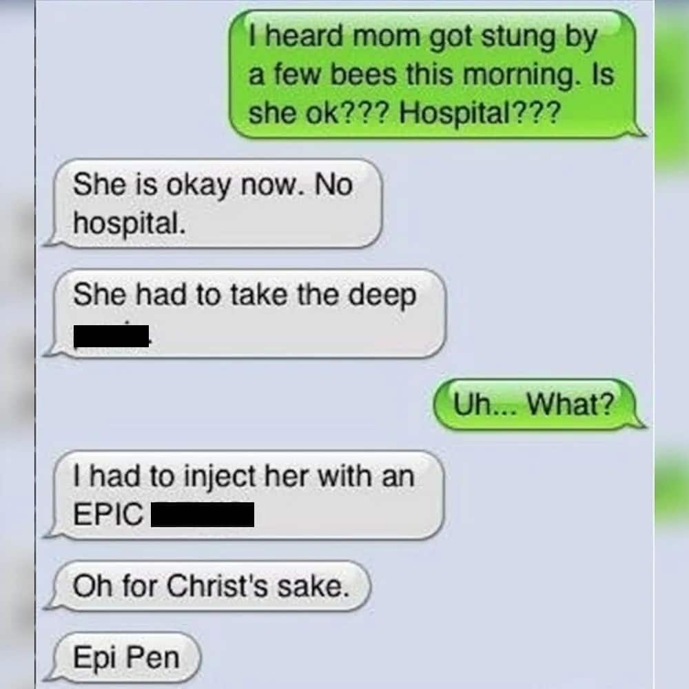 It appears that Mom either underwent some experimental treatment or Dad struggled to send a coherent text message, resulting in an unexpectedly inappropriate message. The exchange highlights how miscommunication and misunderstandings can occur even within close-knit families during worry or concern.