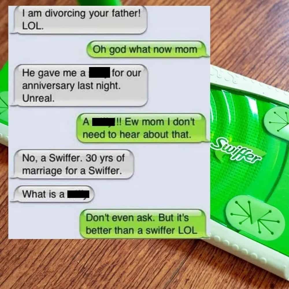 After all, no one, regardless of their age, wants to hear about their parents’ intimate lives. Furthermore, receiving a Swiffer as an anniversary gift is humorously inappropriate and bewildering.