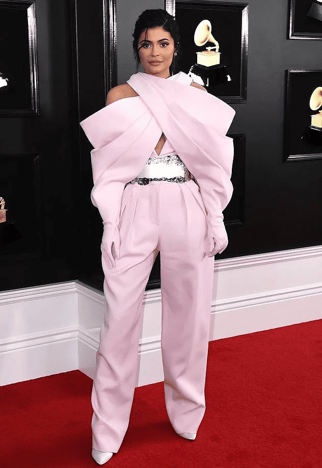 When attending an event as prestigious as the Grammys, it’s only natural to anticipate a glamorous and show-stopping appearance. However, one can’t help but ponder what was going through Kylie’s mind when she chose to don this rather ghastly powder pink suit, complete with matching gloves that seemed better suited for a kitchen task like washing dishes.