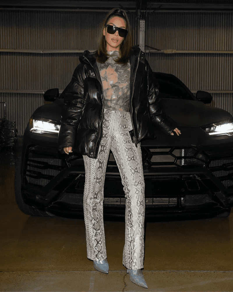 Kim strikes a pose that would be right at home in one of her husband’s rap videos. Her hair is fabulous, and the sunglasses are a stylish touch. It’s just unfortunate that she decided to don a jacket that resembles a garbage bag. Furthermore, her snakeskin pants seem to be at odds with her shirt.