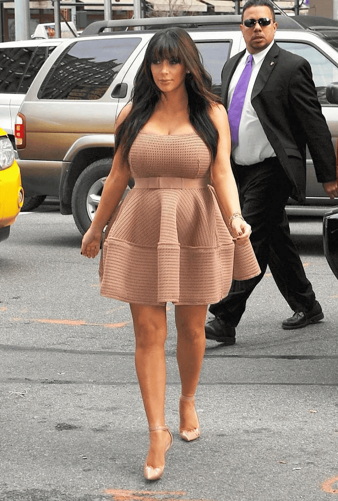Moreover, the silhouette isn’t the most flattering, and there’s that statement belt again, also in the same peach hue. It’s safe to say that this wasn’t one of Kim’s most flattering looks.