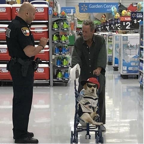 His dog isn’t obstructing anyone’s path, and there are probably a couple of kids in the store making way more noise. We sincerely hope this officer is just admiring this super-cool dog and not considering asking them to leave.