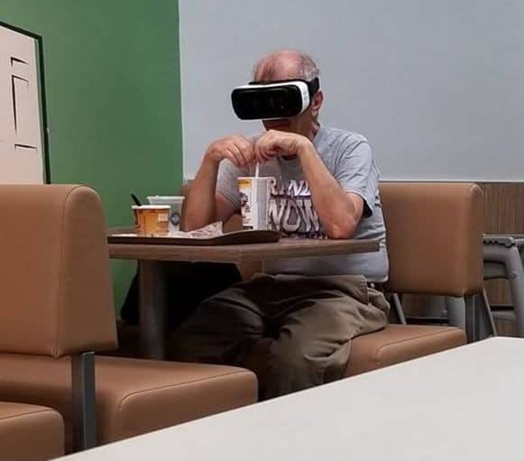 Instead of poking fun at this gentleman, let’s give credit where it’s due. Anyone who’s ever set foot inside a sprawling store has likely experienced that overwhelming desire to be anywhere else. What better escape than donning a virtual reality headset?