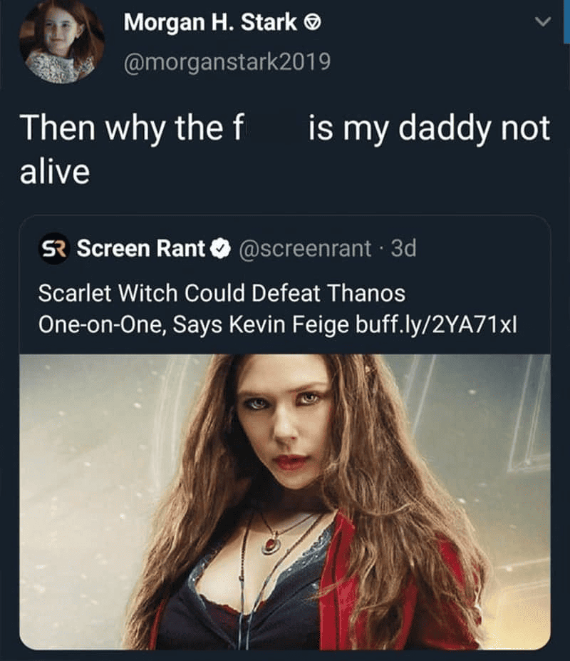 Unfortunately, poor Morgan Stark had to sit idly by, wondering why her father wouldn’t make it home. And to make things worse (if that’s at all possible), he would’ve come home had Scarlet Witch intervened. At least, that’s according to a tweet by Kevin Feige, the president of Marvel Studios.