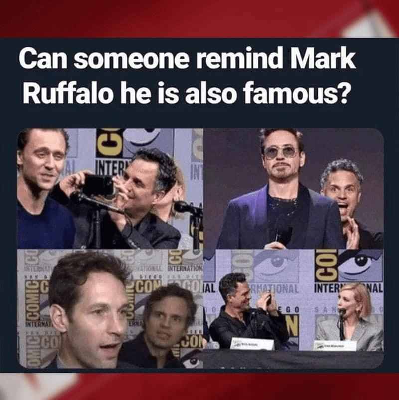 Could someone kindly remind Mark Ruffalo that he’s also a celebrity? It’s quite amusing to see a celebrity fawning over other celebrities. Mark, those are your colleagues – you’ve probably spent more time with them than your family during filming, right? One can’t help but wonder if he’s disappointed that his co-stars aren’t as starstruck when they encounter him in everyday life.