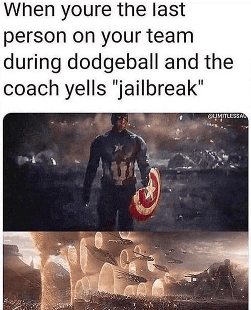 This meme perfectly captures the feeling of a dodgeball jailbreak. Suddenly, reinforcements pour in from all directions, making it seem like you have millions of allies. The only snag is that the opposing team also gets reinforcements. Ultimately, the dodgeball showdown often concludes shortly after the jailbreak, leaving you without the epic showdown you hoped for.