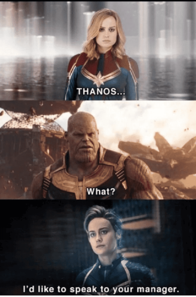 “Karen” is often used colloquially to describe someone who exhibits entitled and demanding behavior, often unreasonably or aggressively. In this meme, the idea is humorously extended to Captain Marvel, portrayed by Brie Larson.