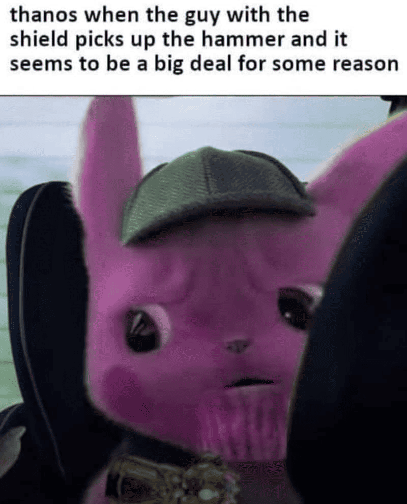 The meme humorously imagines how Thanos, who likely has no prior knowledge of Norse mythology or the significance of Mjolnir, would react to this situation. It uses the popular “confused Pikachu” meme format to humorously depict Thanos’ bewilderment while the rest of us had surprised expressions when witnessing the scene in the movie.