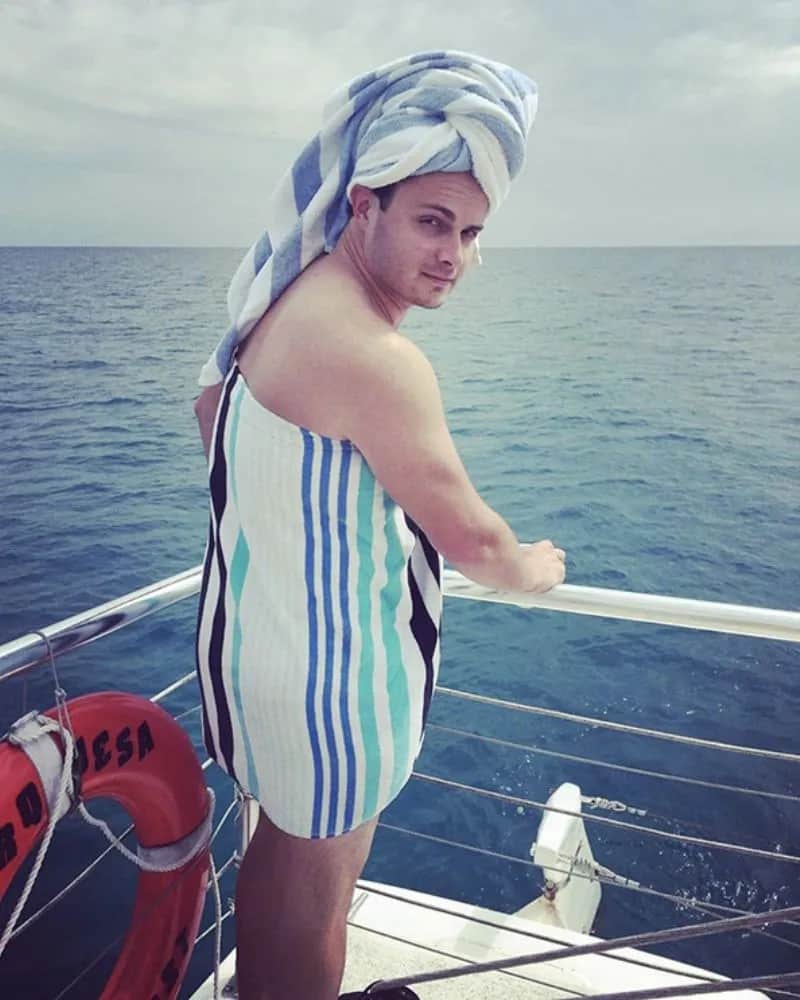 This gentleman has nailed the yacht vibe with his two towel wraps, one elegantly adorning his head and the other draped around his body. He pays homage to the primary Insta girls who have perfected this art of casual luxury.