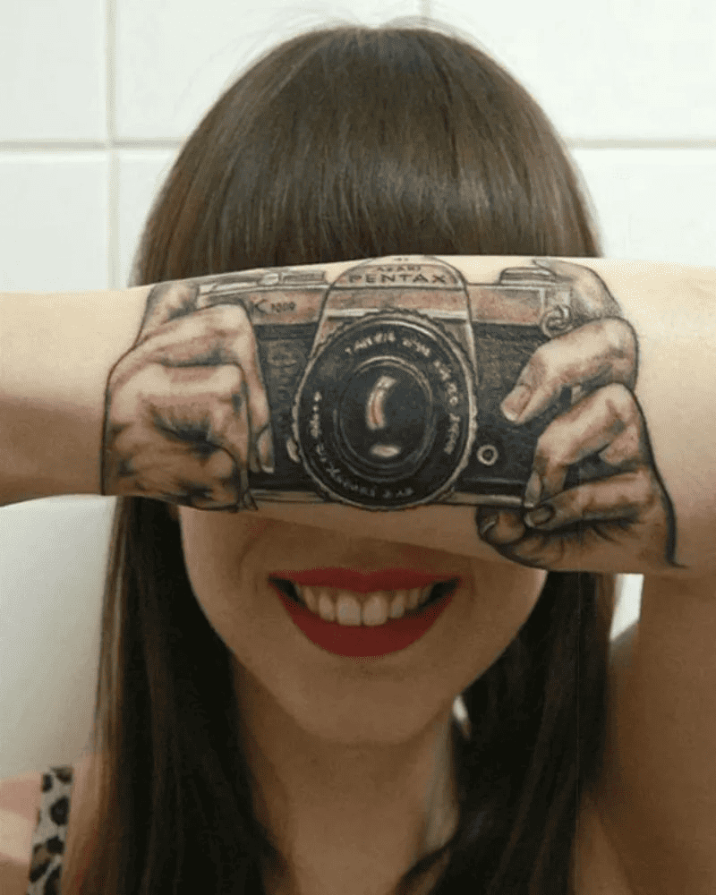 Upon first glance, this tattoo might appear somewhat unusual, but when you consider the possibilities it offers, its appeal becomes evident. Specifically, the wearer no longer needs to mimic holding a camera with her hands—now, a simple lift of her arm positions the camera perfectly. Remarkably, it’s a unique party trick that certainly stands out!
