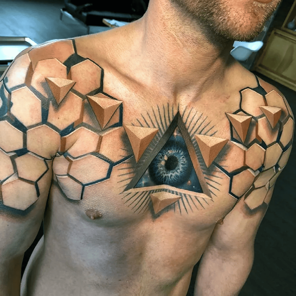 The next tattoo we encounter is a complex composition focusing on a colossal, floating eye encased within a pyramid. While the symbolism and intent behind this ink remain shrouded in mystery, there’s no denying its undeniable coolness factor.