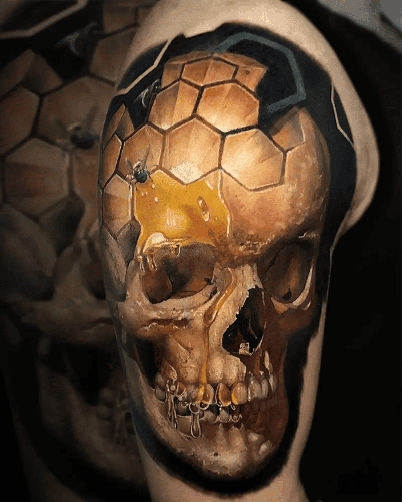 If the previous tattoo showcased the intriguing utilization of hexagon skin tiles, the following design takes fascination to another level, albeit with a touch of unsettling imagery. This tattoo, while maintaining the hexagonal pattern, introduces elements of bees, a skull, and dripping honey, forging a composition that defies convention and challenges perceptions. It juxtaposes the natural world and the disquieting, prompting contemplation and intrigue.