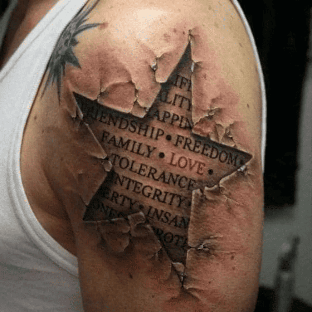 In this body art, the wearer has chosen to emphasize the qualities they hold dear, with “love” taking center stage. Additionally, the star-like symbol suggests that those who possess these traits are leading a commendable life.